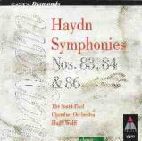 2014年9月21日 Hugh Wolff, The Saint Paul Chamber Orchestra 83番を聴取。 No.83、84、86の3曲のセットが1枚で収録されている。ハイドン音盤倉庫にも3曲目のNo.86について好演の記載あり。今回は、収録順の1曲目のNo.83から聴取する。モダン楽器で、奏者の数はやや多め。vn.は対向配置。録音は鮮明だが奏者が多いためか、クランプ、アントニーニの様に、弦楽器の各パートの奏者までは分かるような録音ではない。小ホールの客席の中央で、やや近い位置で聴いているような録音。