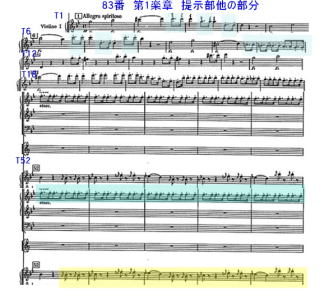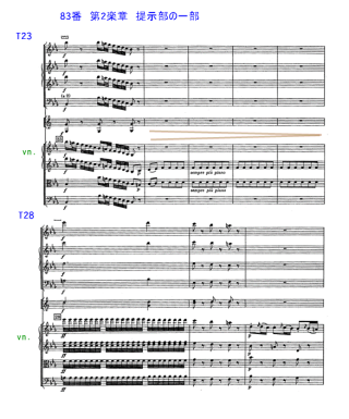 8分音符(ただし3連符)の動機は、スコアではスラーで表示してある。マリナーの場合は、スラーではなく通常の旋律で、スタッカート気味にやや「小刻み」に切れるように表現している。スコアの版の違いかもしれないが、過去に聴取して来た中で、この表現は、類似で聞いた記憶もある。スラーの旋律だと、ひとつ前のT62の4分音譜のスラーの旋律の延長になる雰囲気。提示部を半終始する際は、柔らかい雰囲気が続くことになる。それに倒して、T63からスラーでない旋律だと、柔らかい雰囲気は続かない。この楽章はNo.82と異なり、様々な旋律が登場しない分、冒頭からT4までの間の旋律の中、短い動機で終始、展開されていく。T52からの第2主題の経過部分も、元々、冒頭のT2から派生している。このため、楽章内で、短い動機が様々に随所で展開していく。このため、数種類の動機が、各パートなどで、どの様に展開していくかが興味深い。マリナーの演奏は、この中でスコアとは違う表現なのは興味深い。なお、この手法は、再現部での終わりの部分でも同様な表現。