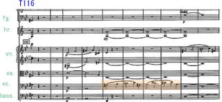 一つ前のNo.84で、弦の奏者について触れた。第1楽章の展開部の最後の方で、「p」の部分がある。再弦部の冒頭の「ff」に対して、弱音で繊細な聴き所のひとつ。T120でvc.の旋律で独自の動きがある。この部分でvc.はsoloで引いているかの様に、弱音の世界。他のパートもhr.を含めてよくわかる。なおこの部分で自筆楽譜は、vc.とbass.は9段の五線紙の中で同じ部分になっている。しかしT120ではvc.表記が明記されている。