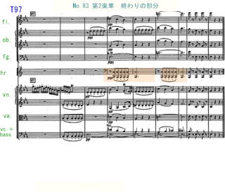この第2主題は、展開部で調性、音程を変えながら様々に展開するが柔らかい雰囲気が多いので対照的。再現部は提示部と違って、少し柔らかい表現となり、T164のob.と違ってfl.の旋律がアクセントを添えている。一転して第2楽章 Andanteは、ゆっくりしたテンポ。