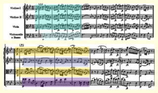 2015年(平成27年)5月16日 R.ノリントン チューリッヒ室内管弦楽団 を聴取。ノリントン独特のレガート奏法が存分に満喫できる第1楽章。序奏の後の第1主題の動機の一つT23の僅か1小節の中に、スラーとスタッカートの箇所が第1vn.に混在。この部分の対比がノリントンの演奏では、明白に聴き取れる。この動機を含む楽章全体が、転調、変形され、各パートで受け渡せされながら至る所で展開する。