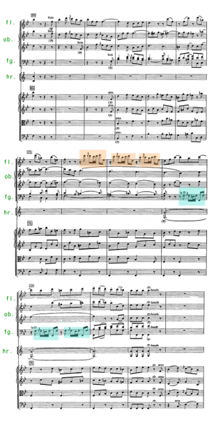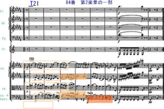 調性、拍子などは異なるが、No.47の出だしと類似している雰囲気。(下記のブログに譜面あり)弱音で弦楽器のみで登場し、少し遅れて、低弦が追従するような部分など。管楽器を含めたsoloの箇所。2つの調性の異なる展開などは、No.84の方が、やはり変化に富んではいる。