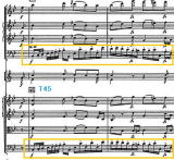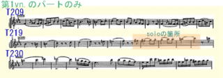 パリセットの6曲は、弦楽器のsoloの箇所は少ない。特にvn.はさらに少なく。通常は、この曲ではvn.のsoloの箇所がないと思っていた。最初のNo.73の後半にも記載したが、必要に応じてsoloを採用している箇所もあった。このNo.84も同じ様にFinaleの終わりに近い部分。この頃の特徴の一つ。Finaleは終わりそうで終わらない箇所で引っ張っていく中で、T216からT221は、第1vn.がsoloになっている。