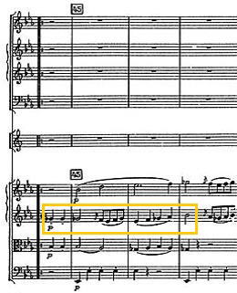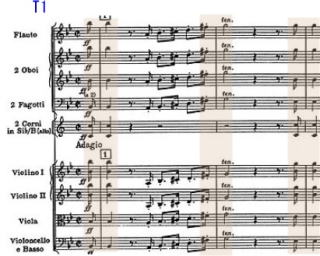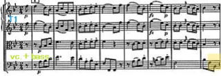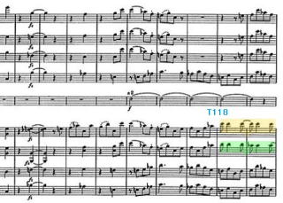 弦楽器はこの箇所はピチカートで得てして管楽器のsoloの箇所が引き立つ部分。hr.はあくまで持続音であるが、聞きたい箇所ではある。しかし余り目立たないのが残念。No.83にも共通するが、弱音の箇所では弦楽器と管楽器の音色のバランスはそこそこある。しかし録音によるのか強奏のTuittiの箇所では、厚みのある弦楽器に押されてる管楽器の音色が気になるところ。 |