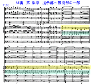 さて、No.85の演奏であるが、管楽器の各パート、特に2人のob.の配置が良く分かる。この曲の第1楽章は、かなり長い展開部になっている。(序奏 8、提示部 103、 展開部 101、再現部 63の合計276)展開部と再現部が、ほぼ同じ長さになっている。
