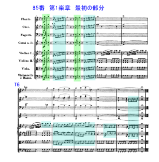 2019年6月18日 85番 N マリナー を聴取。第1楽章 T12から始まる第1主題。簡潔かつ印象的な動機。第2主題は同じ旋律を属調に殆ど変えただけなので、この楽章を通して、第1楽章の第1主題は終始、支配される。第1、2vnのT12から提示される動機は、短い4小節単位だが、スラーで書かれている。それに対して低弦はスラーではない刻む様な対旋律。この2つの音程と音色が異なった動機が、対比されるのが聴き所のひとつ。T14-15のスラーを第1,2vn.でスラーでないために、低弦の対旋律と第1,2vn.の2つは、少し似たような雰囲気になっている。
