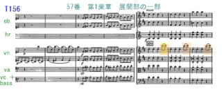 このような手法は、ハイドンには過去にも採用をしていると思う。余り気づかれないかもしれないがNo.57の第1楽章の第1主題。打楽器群は入らないが序奏付きで、同じD―durの調性。第1主題の短い動機が展開部のT160で8分音符のみだが第1vn.のみで演奏する。この手法などは、ここでも共通している特徴だと思う。