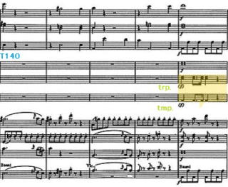上記のT34の箇所は、timp.のみがこのリズムを受け持っている。しかし展開部の終わりの方、T144では、tmp..以外にtrp.がユニゾンで入っている。しかし2小節のみでT146からは]trp.入っていない。それに対して第3、4楽章は、打楽器群は単独で入っていないようだ。