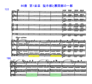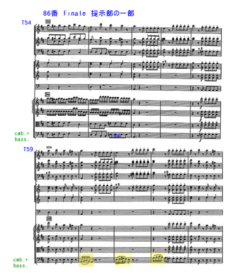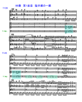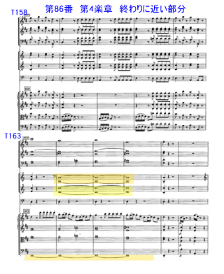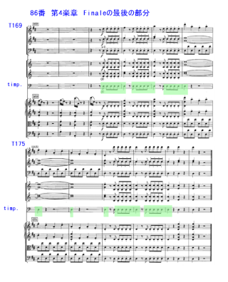 No.86は、自筆楽譜では最初に打楽器を除いて書かれていた。その後、Finaleの最後の部分に打楽器だけ2段ごとに、追加で書かれている。過去のレビューで追加の打楽器は、第1楽章では、T144の箇所では、打楽器は独自の旋律がはいるが違和感はない。