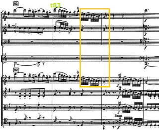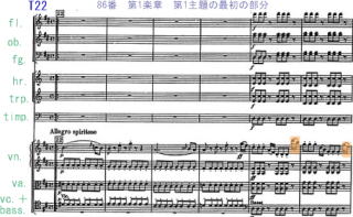 管楽器の奥行き感はやや分かり難い。hr.は前の2曲にも記載したように、 ファイの様な派手な登場の箇所はない。hr.以外の管楽器の音色は、奏者の多い弦楽器に負けないように、際立っている。ライヴ録音ではないと思うが、菅楽器が主体のsoloの箇所でも、弦楽器を抑えたような、処理がしていない。弦楽器と菅楽器のバランスが良好。 No.86はfl.は1名だが、再現部T181の低音域のもよくわかる。下記のN マリナーのレビューに譜例あり。