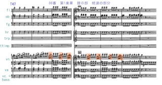 さて、打楽器群の旋律はどの様に書かれているのか? 実際、序奏のT8から打楽器群は、他のパートと同じような感じで書かれているようだ。しかし注意深くスコアを追ってみると違う箇所が一部ある。第1楽章のT34のtimp.。 行進曲風の付点リズム。スコアをざっと、通してみると、この付点のリズムは大半は打楽器群が受け持っている。