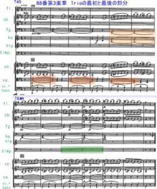 上記の音盤倉庫では中庸なテンポでオケの厚みを生かした演奏と記述がある。確かにこのレビューはポイントを得ていると思う。No.88は、第1楽章は、打楽器群が全く登場しない。第1楽章は弦楽器が登場しない分、tuitti の f の箇所でも、弦楽器のみで表現することになる。一方、第2楽章以降は打楽器群が登場する。テンポが比較的似ている。第1楽章と第4楽章のtuitti の強奏部分の対比が聴き所となっている。