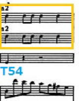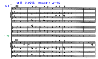 打楽器のtimp.も、必要に応じて、少し装飾を加えているようだ。第3楽章の T42の部分。Tuittiで全てのパートは、同じ位置で本来終始する。しかしtimp.のみ、わずかだが遅れるように終わっている。timp.は第3楽章で既にFinaleの動機が登場する。timp.の役割を目立たそうとしたのかも。なお No.94と同様に第3楽章 Menuetto のtrio の部分も、Soloの vc.に対して、伴奏する他の弦楽器のパートもsoloで弾いている。
