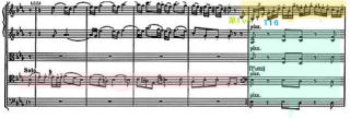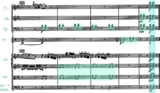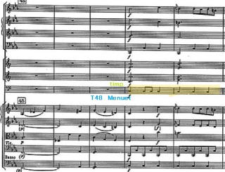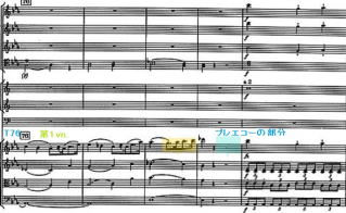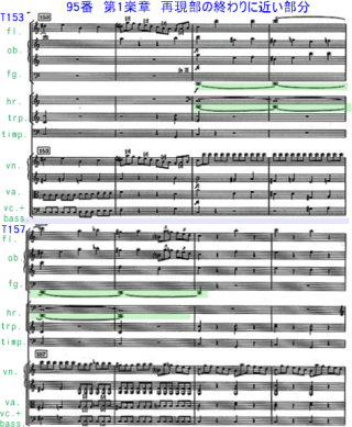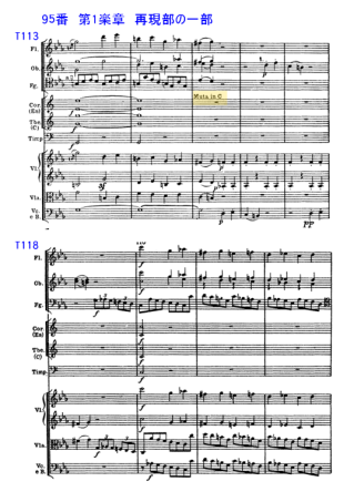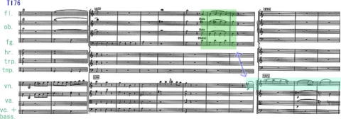 第1楽章の終わりに近い部分。冒頭のc-durの調性とは全く異なり、長調で明るく締めくくる部分の一部。全ての楽器が登場しT153からは第1vn.の4分音符。第2vn.以下の主旋律。hr.を含む、低音の持続音。これらが、T153で一体となる中、低弦の持続音も明白に聞こえる。