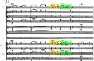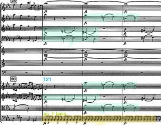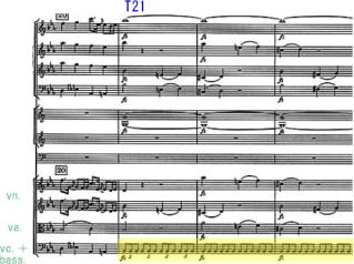 第1楽章のT21の部分。ここまで3連符の動機が登場しなかったが、T21で低弦で最初に入ってくる。T ファイなど 低弦の音色の切れを生かして、このパートを強調したい部分。ドラホシュの場合は、あくまで柔らかく演奏。