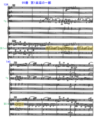 2023年11月20日 95番 A フィッシャー デンマーク室内管弦楽団 を聴取。 No.93とNo.94で スコアには記載をしていないsoloの箇所に触れた。第1楽章のT37の部分。スコアにはfg.の記載があるが、第2vn.には記載がない。しかしこの部分ではsoloになっているようだ。再現部の類似箇所でfg.とともに、第1vn.の高音部でのsoloの箇所がある。これに呼応して、提示部でも第2vn.をsolo にしたかもしれない。