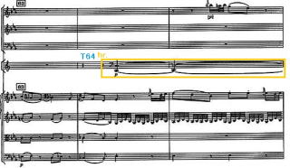 もともと、どの交響曲にも各楽章間で動機を共有し統一感を与える手法はある。遅いテンポで初めて気づいたのかもしれないが、第2楽章の終わりに近い部分。8分音符の短い動機が終わり頃にT66でfg.から登場する。T15の第1変奏の部分で似たような旋律があるが、codaまではそれほど目立たない。T66からT70の最後まで登場する。