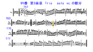 2015年7月29日 C.デイビス ACO No.95 を聴取。No.96と違って、vc.のsoloが活躍。第2楽章の冒頭の主題が、かなり目立ち、他の主題は、余り目立たない。しかしT6~7のvc.(solo指定でなし)の旋律は、時折ではあるが、重要な役割を果たす。(その後のT20.26など) また、第3楽章のtrioでもsoloのvcが活躍。デイビス盤では、比較的右端に位置する。 |
