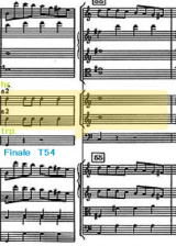 Finaleは、形式的な明快さを欠き、ホモホニックな主題とフーガ部分が交互に現れる。T55でtimp.から登場する動機は、codaに向かって主たるリズムのひとつになる。バーンスタインの演奏では、T55でのhr.の、この動機の登場を旨く強調させたと記載した。クイケンの場合はそれほど目立たず。 |