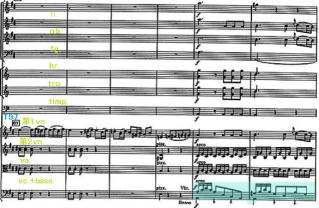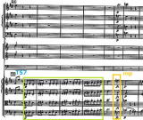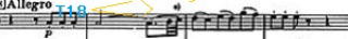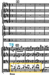第3楽章 MenuetのT31の部分。ここから低弦のパートが分かれて、レンジに広さと音色が楽しめる箇所。録音によっては、vc.とbass.のパートが分かれた位置に聞こえて、さらに広がり感を楽しめる部分ではある。マリナーの場合はどちらかといえば、低弦に関しては余り分離感がない方と思われる。 |