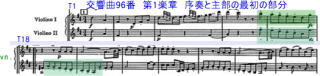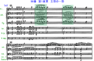 C ローゼンの古典派の様式の中で序奏と主題との関係について何度か取り上げてきた。No.90、No.98の様に、序奏の旋律が主題の旋律と明白は関連性がない場合、序奏の役割について記載がある。すなわち主題の動機を引き立てるためには、序奏はあくまで、仄めかすことが必要との立場。名曲解説全集にはNo.96に関して、序奏と主題との関連性についての記載がない。序奏のT4-T5 の旋律が既に、第1主題の伴奏の伴う旋律として仄めかしていると思う。しかし第2番が受け持ち、第1主題の伴奏に伴うので分かり難い。