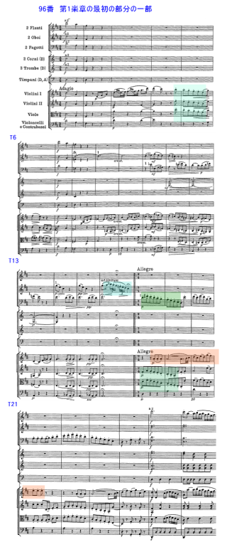 池辺晋一郎 氏 著 「ハイドンの音符たち」にもこの記述がある。音符としての象徴の視点から分析し、私の苦手な和音などが多く登場して、理解が難しい部分も多い。この序奏と第1主題に関しては理解がしやすい。第1主題は、通常は紙面の関係もあっ譜例は1段のみが多い。しかしこのNo.96の第1楽章の第1主題に関しては、主旋律と対旋律がセットになっていることもあり2段で掲載されている。序奏のT5の下降する動機とT18からの第2vn.の下降する動機の共通性の指摘がある。