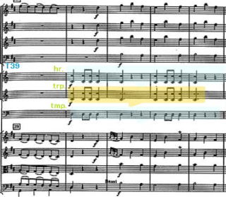 第2楽章の中間部でT39の部分。ここでは、hr.とtrp.が、この楽章では、柔らかい立場で少ししか登場しなかったのが対照的。
