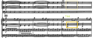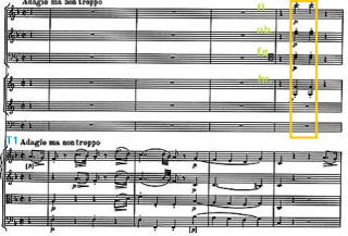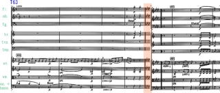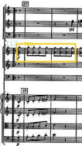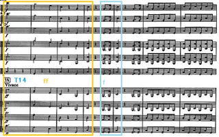 このhr,とtrp.の両端の配置は、FinaleのT16でよく分かる。T16では、hr.が他の楽器を押しのけてfで登場。その後、T24ではtrp.が単独で登場。T32でTuttiとなりオケ全体に広がる。 |