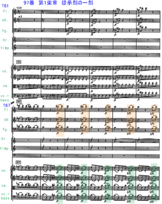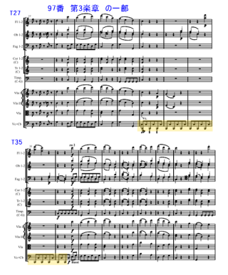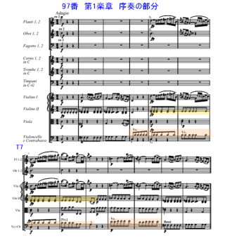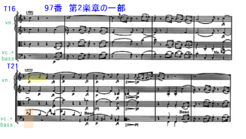 2019年5月21日 エルンスト・メルツェンドルファー ウィーン室内管弦楽団 97番を聴取。No.83のときもふれたが、この第2楽章で、スタッカートの切れの良いリズムについて記載をした。このときは、切れとスラーの対比が良かった点。この曲の冒頭の序奏も同じような箇所がある。メルツェンドルファーの演奏は、No.83の時と同様に第2vn.から4分音符でスタッカートの指示がある。 T2からは第2vn.、vc.+bass.が受け持つ。第1vn.のスラーのある旋律と対照的。このリズムはT13の序奏の最後まで通している。主部からのTuittiとの対比も効果的。