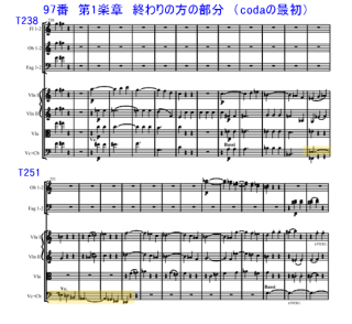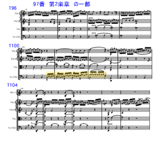 No.97は序奏のT4の部分でvc.の8分音符の旋律が入る。この箇所でもsoloの様に聞こえる。Codaの最初の部分 T250でも過去のレビューではvc.はsoloを弾いている。この箇所もsoloのようで通常の奏者とは変わらない。T261の vc.+bass.の部分(ユニゾン)でも、それぞれのパートは1名ずつのようだ。Fg. Vn. va.は 低弦とは違う旋律で弱奏の部分。低弦はどうも奏者が1名に聞こえる。