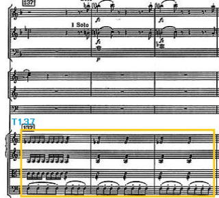 第2楽章の第3変奏の部分。第2変奏の短調の部分が終わって、主調に戻りsul ponticello を挟む部分。通常はT93からの第1vn.の部分から入ることが多いと思う。しかしここでは T85の第4変奏 の最初の部分から sul ponticello になっている。T93の弱奏と 強奏の部分との音量の対比が印象的。T100からのvc.のパートも sul ponticello で弾いているようだ。vc.の sul ponticello の音色は、今まで聞いたことがなかった。Solo のような奏者が1名だから、この音がよくわかるのか? 第3楽章 T32のvc.のパートもsoloの様に聞こえる。