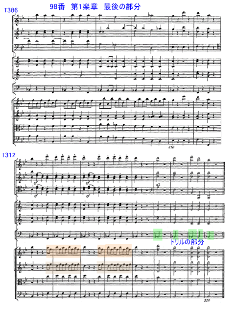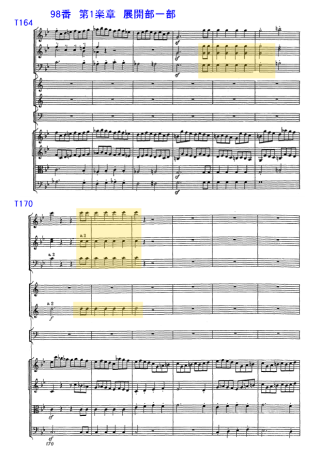 No.98は過去に数々の奏者をレビューしてきた。第1楽章は展開部の途中から、新たな動機がT167から登場する。序奏から提示部を経て T166までこの動機は登場しない。この動機は、その後、最後まで華を添えるように活躍する。各パートの動きもよくわかる。