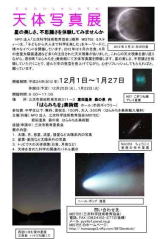 | 2012(平成24)年12月 1日(土)〜1月27日 | 天体写真展 | 三次市君田町 君田森の泉 内 はらみちを 美術館 | 天体写真展〜星の美しさ、不思議さを体験してみませんか | 詳しい案内は、広報みよし12月号及び、チラシを参照。 |