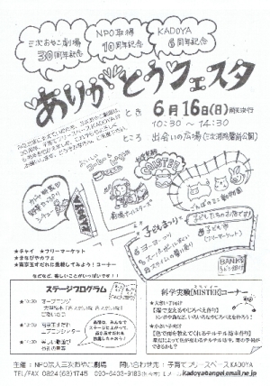 | 2013(平成25)年6月16日(日) 10:30〜14:30 | 科学実験 | 出会いの広場(三次市消防署前公園) | やじろべえ、色の変わるテルテル坊主の製作 | 主催:NPO法人 三次おやこ劇場 チラシは、下記のファイルをクリック |