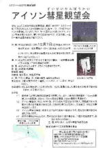 | 平成25年(2013年)12月7日17時〜 | アイソン彗星観望会 | 十日市親水公園バラス場 | アイソン彗星が消滅したため、通常の観望会として開催 | 双眼鏡、望遠鏡で観察 チラシ(クリックでPDFファイル) |