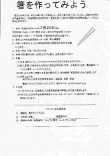 | 2014(平成26)年7月20日(日)10:00〜、13:30〜 | 「ハシを作ろう」 | 生涯学習センター 3階 交流ホール | ヒノキの角材から、加工して箸を作ります。材料費、保険料 500円/人 | チラシは下記のPDFファイルをクリック |