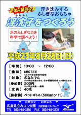 | 2013(平成25)年7月28日(日) 10:30〜 | 水と空気で遊ぼう | 三次市生涯学習センター | 身の回りの材料を使って、不思議なコップを作ります。 | 主催:MISTEE チラシは、下記のファイルをクリック |