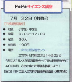 | 2009年 7月22日 | 夏休み 子どもチャレンジ講座 日食観望会 | 三次市生涯学習センター | ![]() |