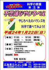 | 2012(平成24)年1月22日(日) | 科学の実験 ニューイヤーフェスティバル2012 | 広島県立三次公園 | 不思議な「やじろべえ」を作ろう 主催:広島県立三次公園 |