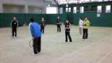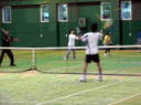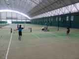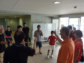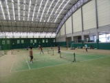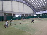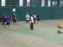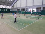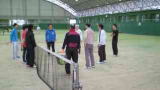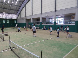 当協会からの挨拶の後、参加者26名がウオームアップを行い、コート4面に分かれて開始。主に2面を使用して、交互にコーチが回りながら、適宜の指導を行いました。当日は、午前中の3時間をたっぷりと行いました。午後からは、希望者を対象に、試合形式を中心に、追加レッスンを行いました。